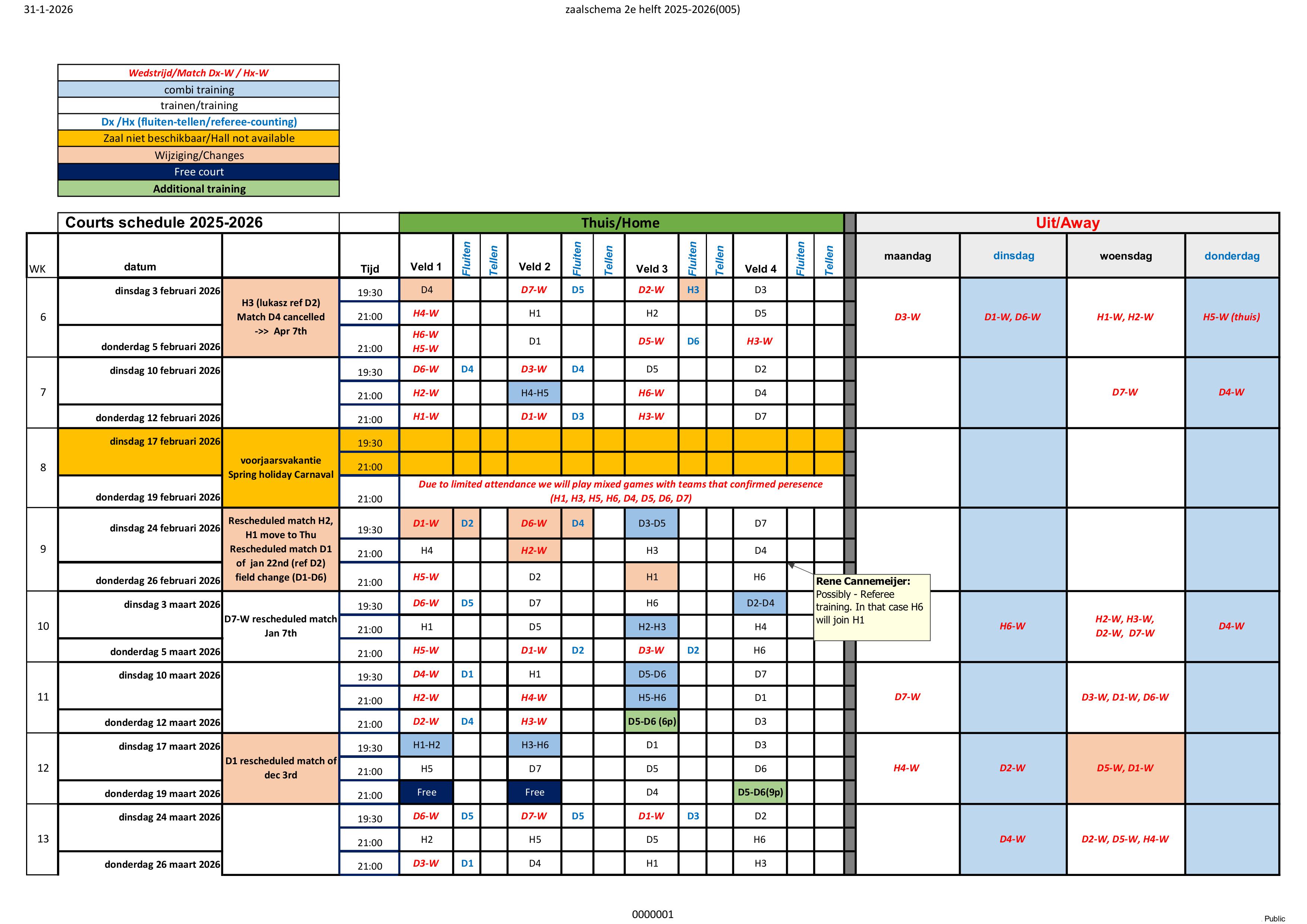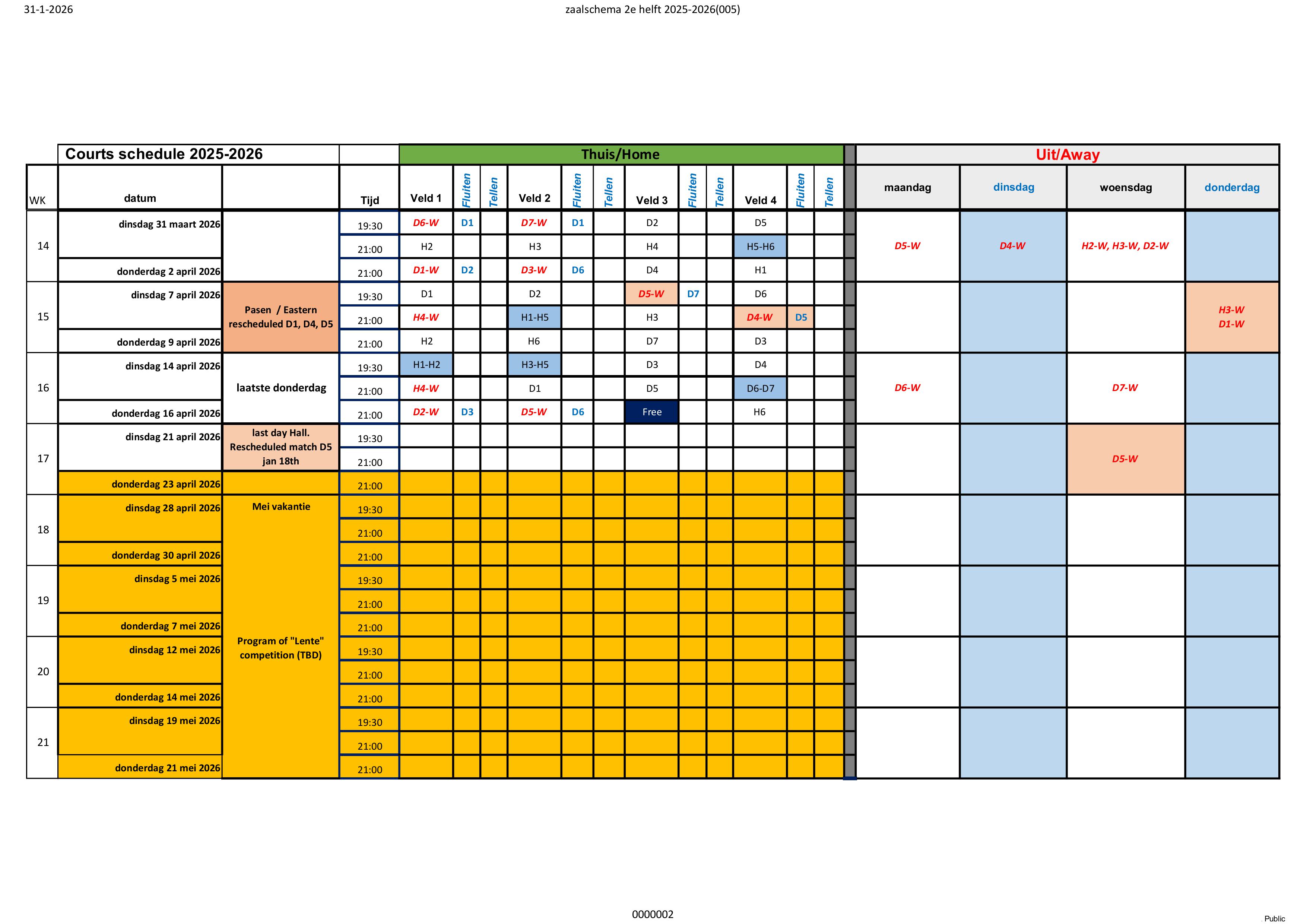 Hierbij het Zaalschema 2e helft 2025-2026 - status 31 januari 2026